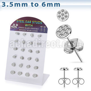 Steel Ear Studs with 3.5mm to 6mm Ferido Glued Crystals, 12 Pairs
