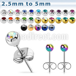 One Pair Surgical Steel Ear Studs with 2.5mm to 5mm High Polish and PVD Plated Ball with Bezel-set Crystal