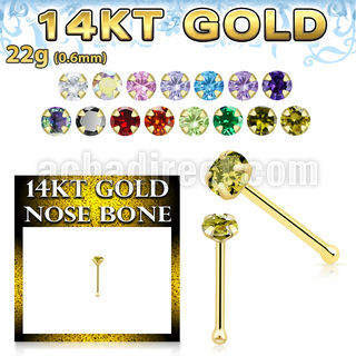 14k Gold Nose Bone with Prong Set Round Color CZ Stone