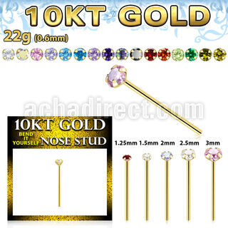 10k Gold "Bend it yourself" Nose Stud with 1.25mm to 3mm Round Prong Set CZ Stone