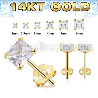 One Pair 14k Gold Ear Studs Square Clear Prong Set CZ Stone