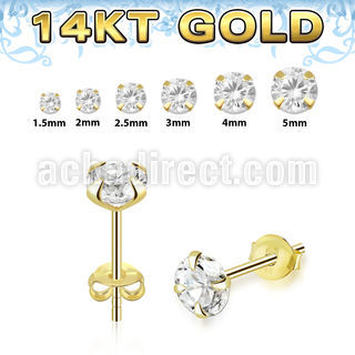 One Pair 14k Gold Ear Studs with Prong Set Clear CZ Stones