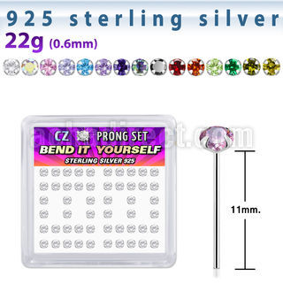 925 Sterling Silver "Bend it yourself" Nose Studs with 3mm Prong Set CZ Stone