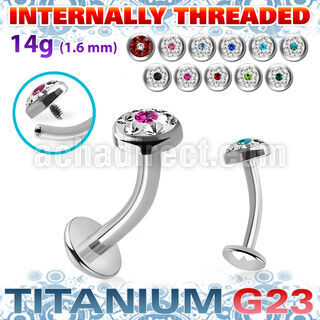 Titanium G23 Internally Threaded Floating Belly Convex Labret with 5mm Top with Clear Ferido Glued Multi Crystals and Colored Spot in the Middle